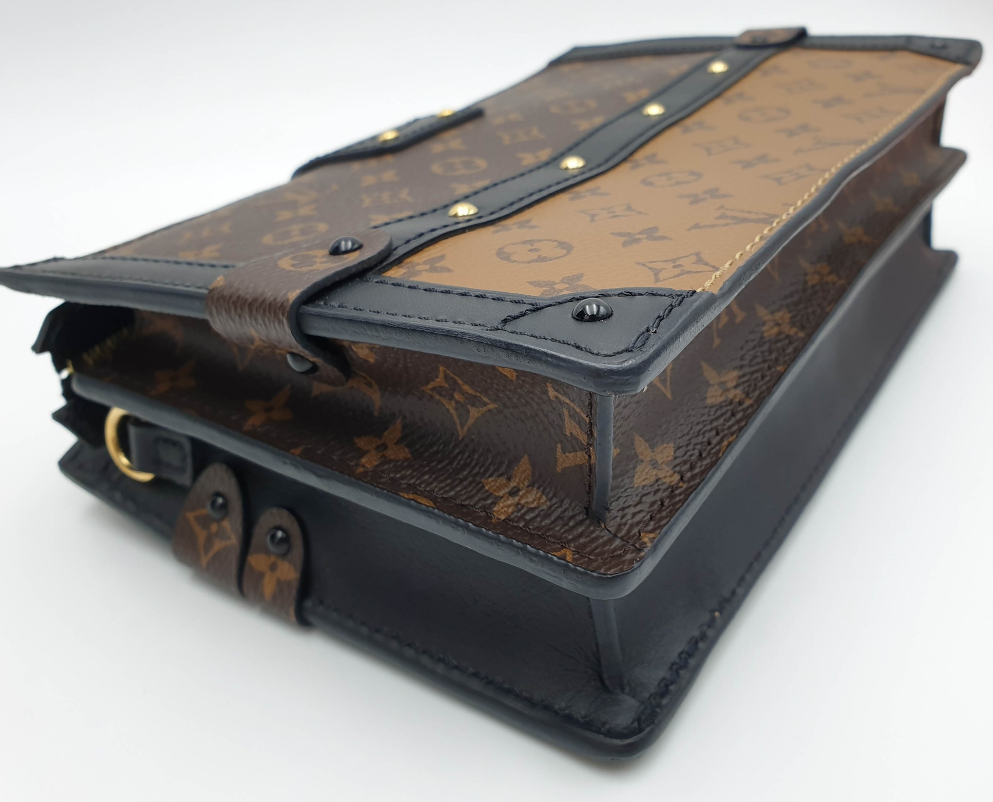 กระเป๋าคลัทช์รุ่น Trunk Monogram และ Monogram Reverse แคนวาส แต่งขอบด้วยหนังลูกวัวผิวเรียบ อะไหล่ทอง บุด้านในด้วยหนังแกะพิมพ์ลาย Malletage
